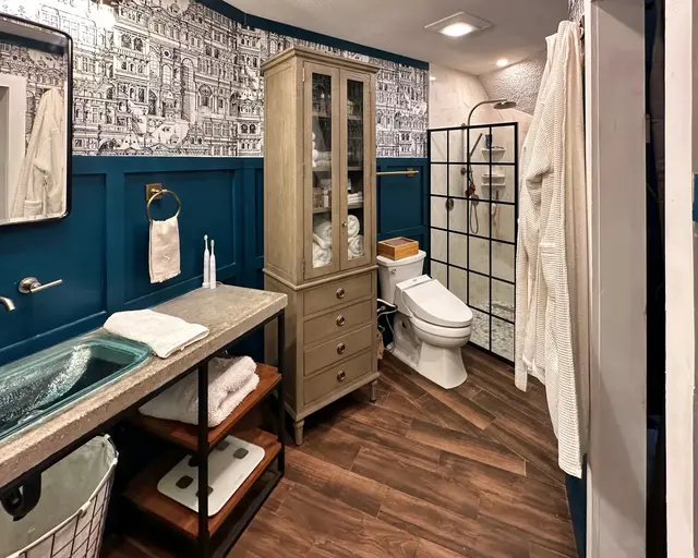 Mike and Tessa’s design and carpentry skills are displayed here in the wainscoting, custom shelving and concrete countertop.