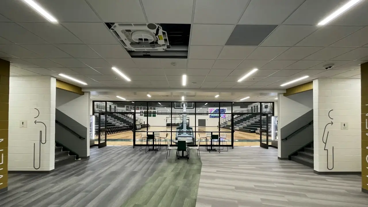 The main entrance to the Bison Activity Dome in Central City, Nebraska. The gymnasium is used for sports events, physical education classes, and community events. Students and area residents will use the dome as a storm shelter during severe weather.
