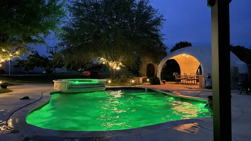 The pool is lit up with bright green lights at night with the kitchen-dining area in the background. Color-changing lights are a fun add-on to the backyard scene. My family and our relatives use this little pool constantly. It’s a great addition to our lives down here.