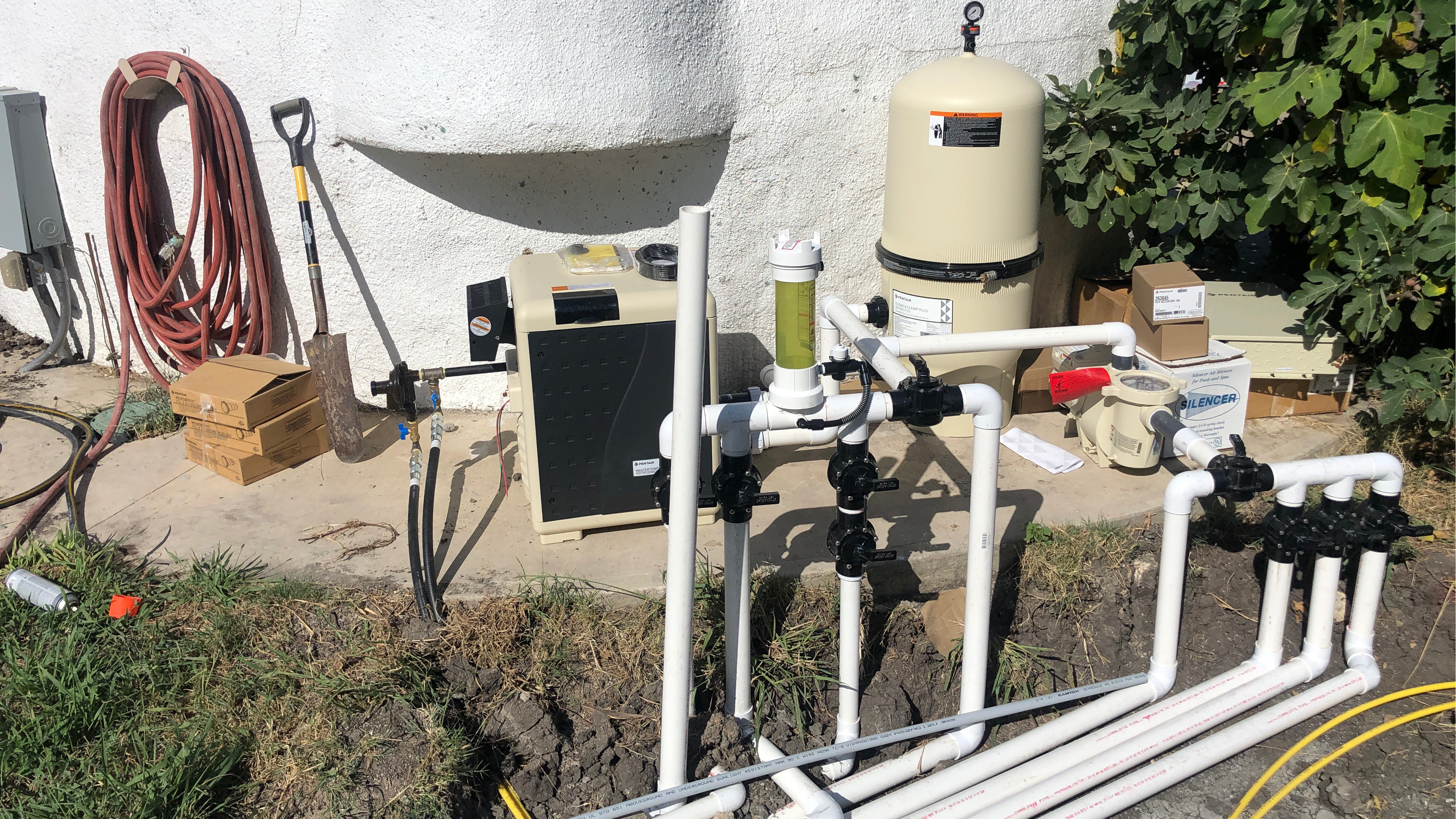 Filter and spa heater were installed behind the outdoor kitchen. It’s amazing the number of pipes that go into plumbing pools.