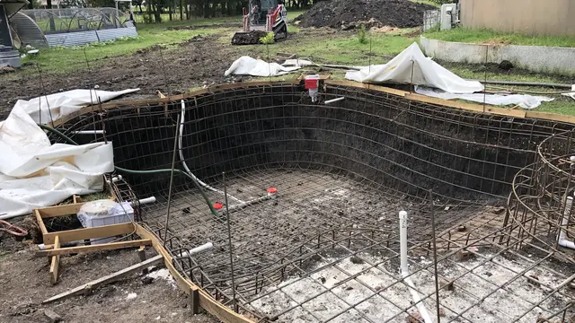 The rebar is done, the plumbing is in, ready to spray concrete.