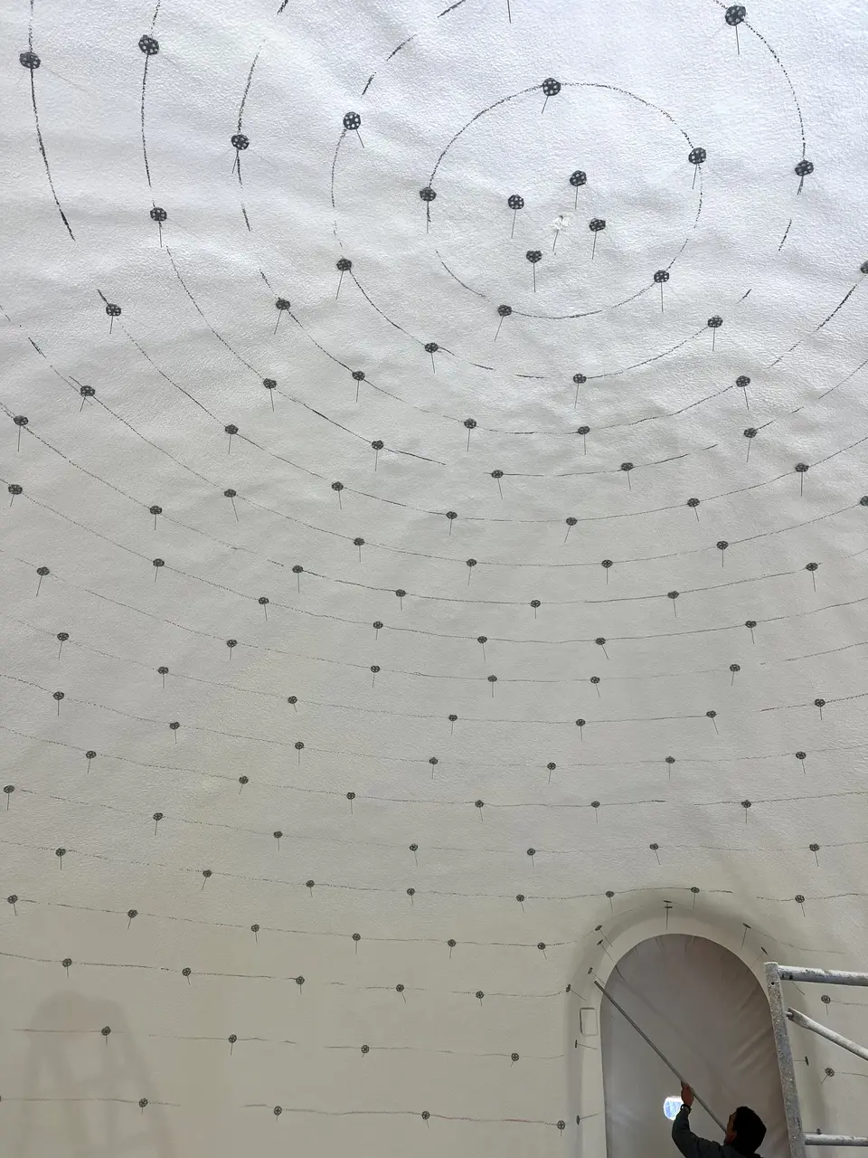 After marking out parallel circles at specific intervals, rebar hangars or stuck into the foam then more foam is applied—embedding the stickers—in preparation for the rebar grid to be installed.