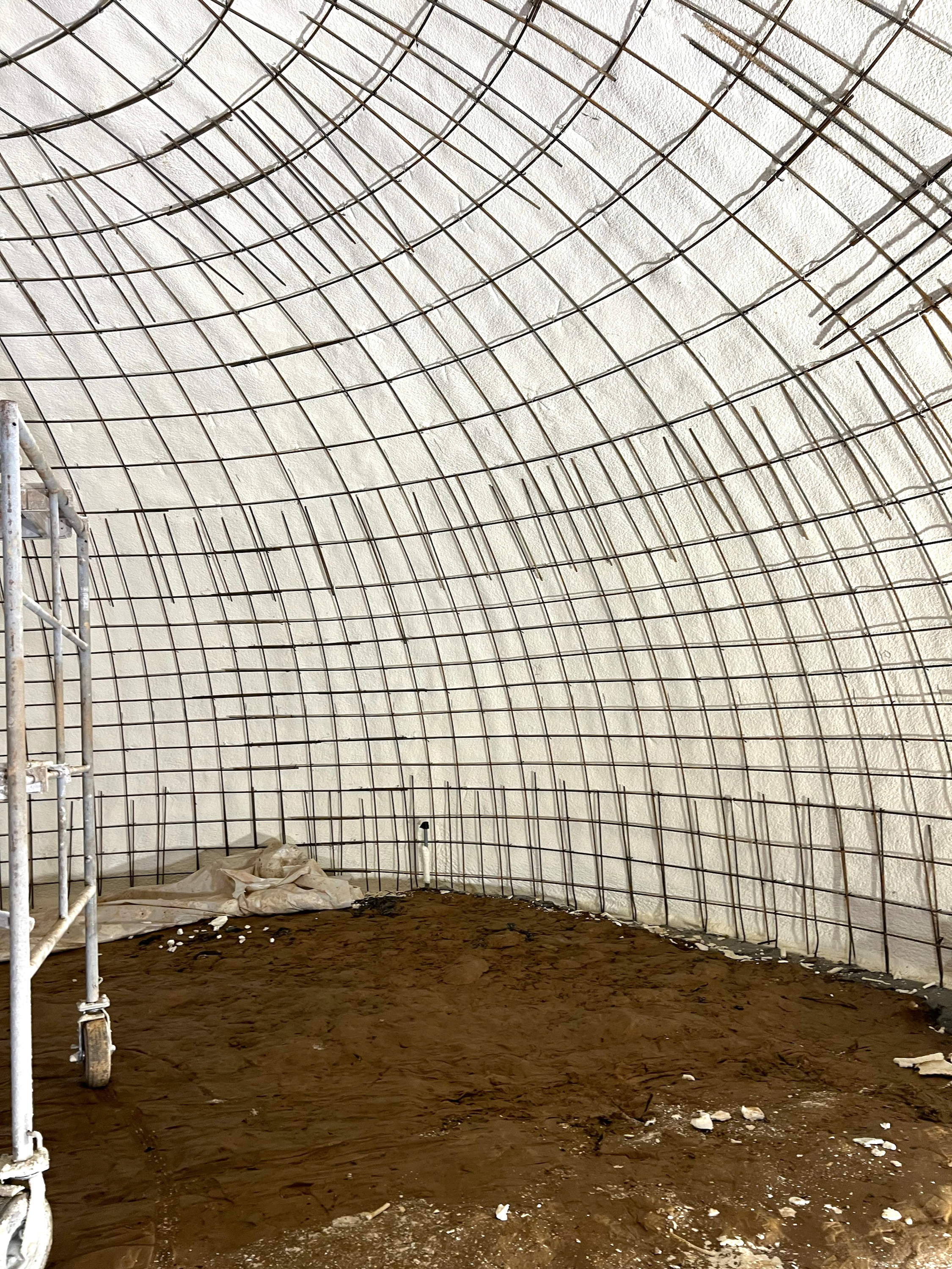 The rebar has been attached to the rebar hangars. You can see the vertical rebar coming up from the edge of the ring beam footing. This dome is ready for shotcrete.