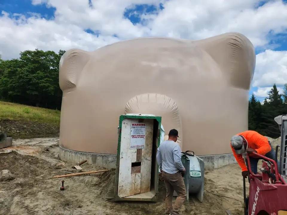 Airforms for houses are generally attached and inflated on the same day. They inflate fast! This airform is inflated at low pressure until the door bucks and spray stops are installed.