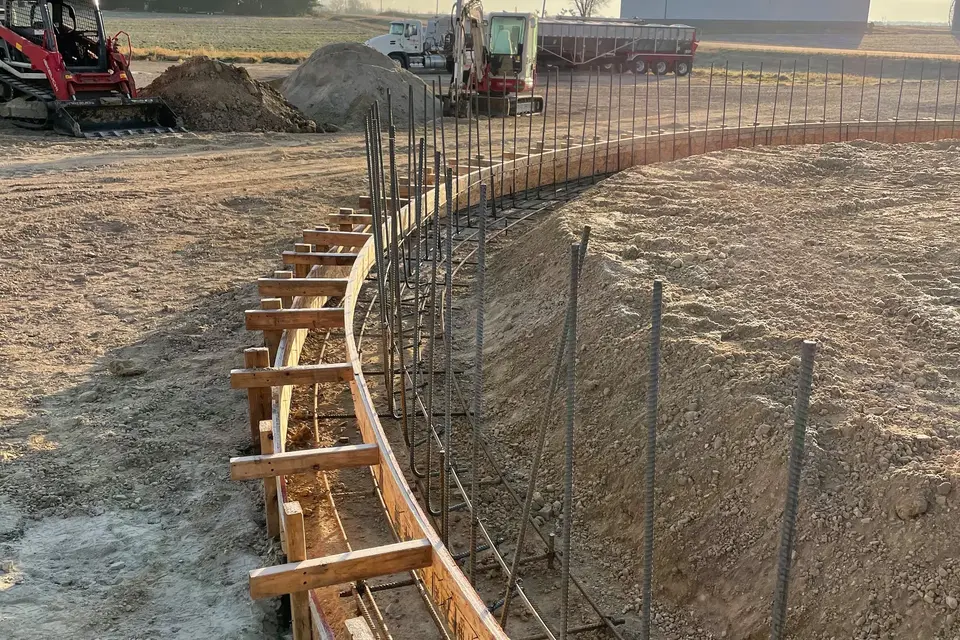 The outer forms are ready, the forms for the step are set, and the rebar is tied. The rebar dowels will extend into the dome’s concrete shell. We pour a step into the footing for Airform attachment.
