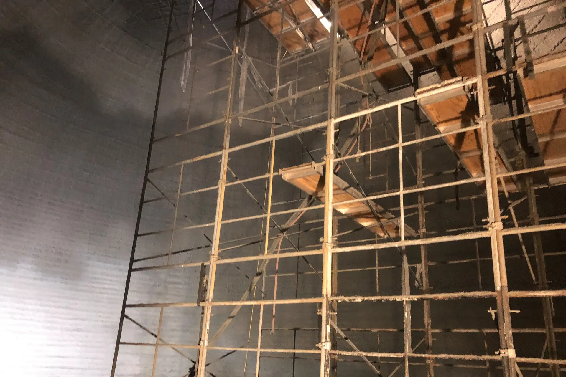 A second mat of reinforcement was required at the top of the dome to help support and distribute the weight of the conveyance equipment that will rest on the top of the building. We spray and embed the first layer of rebar to ensure that it is well encapsulated, then install the second mats. Paxis scaffolding provides an excellent building platform.