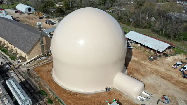 The newly inflated Airform membrane towers over the neighboring buildings at the retail fertilizer plant in Elkhart. A wood structure was razed to make room for the dome.