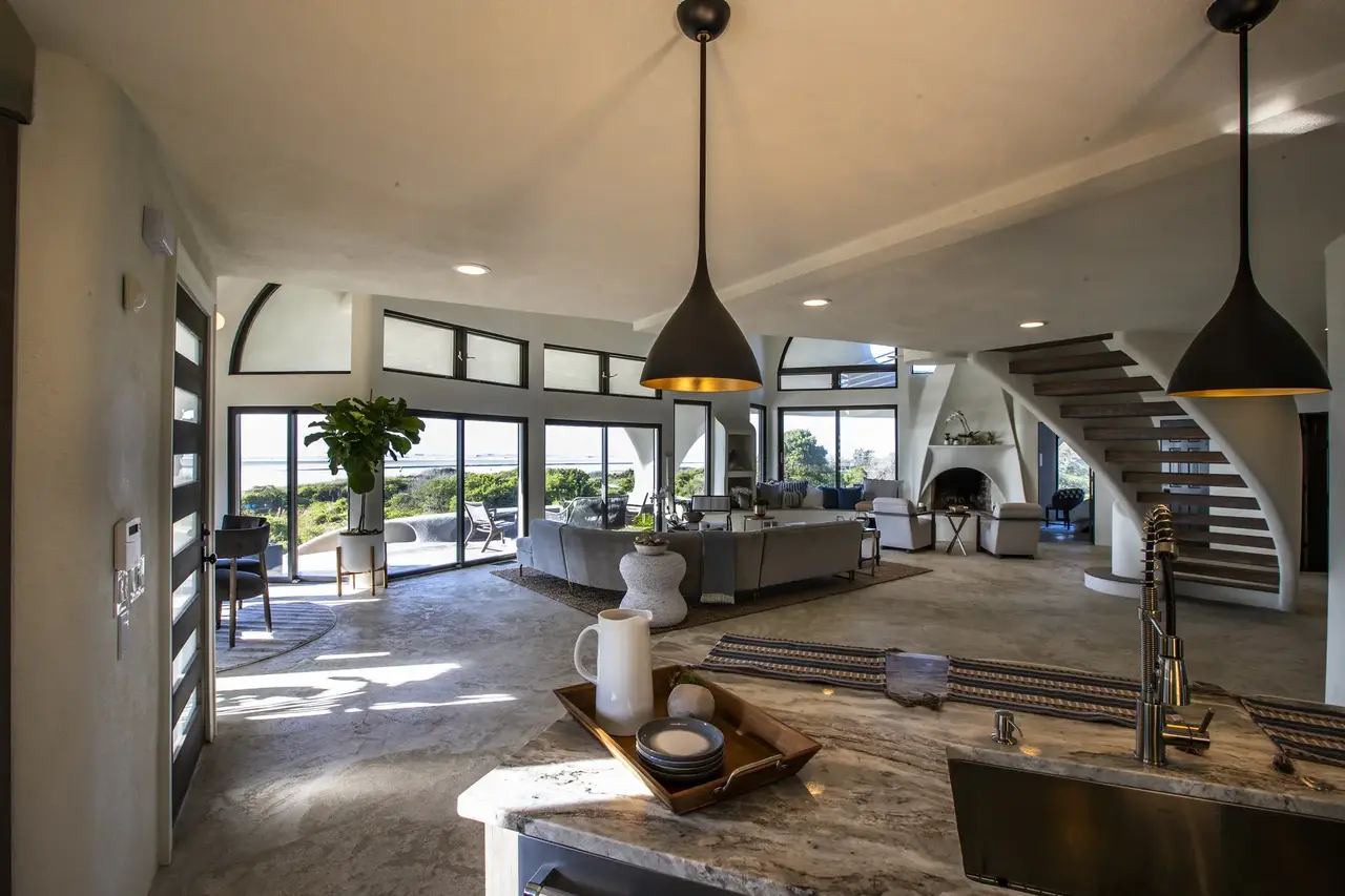 View from the dining table of the living room and the beautiful oceanside beyond the windows.