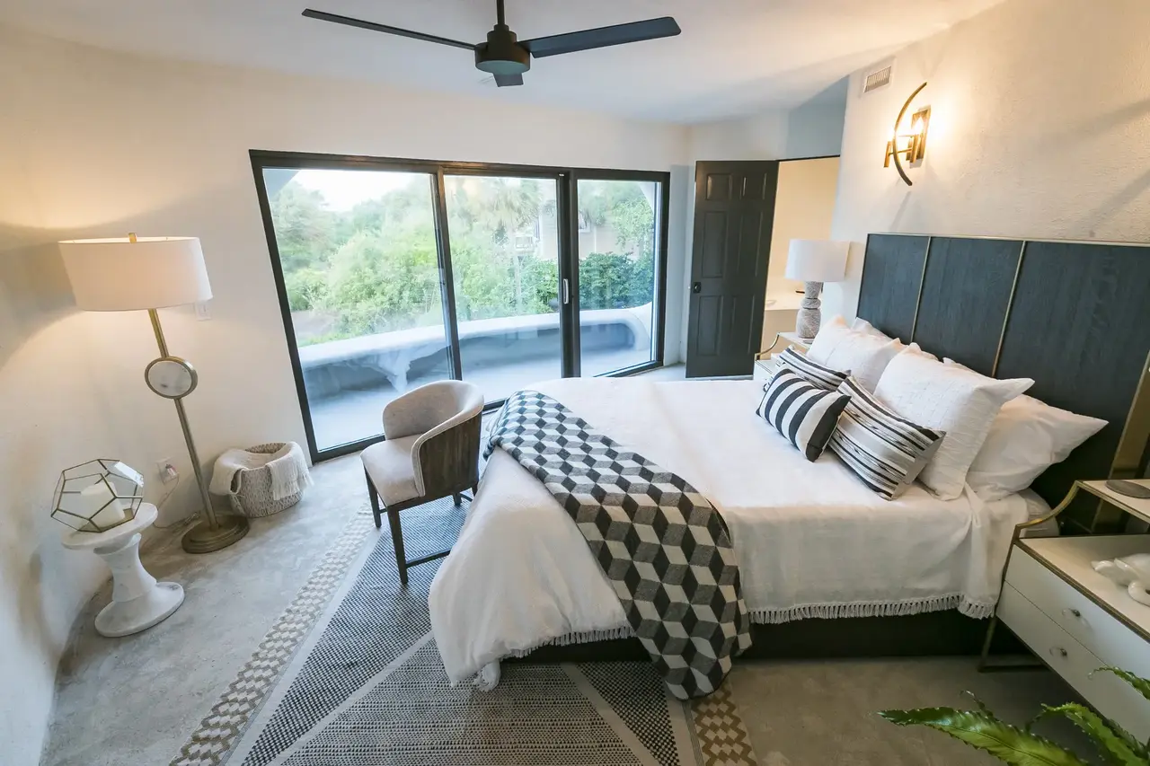 A view of the master bedroom’s 159 square feet private deck and the beach beyond