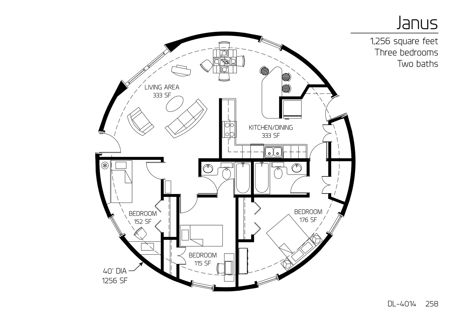Janus: 40' Diameter, 1256 SF, Three-Bedroom, One Bath Floor Plan.