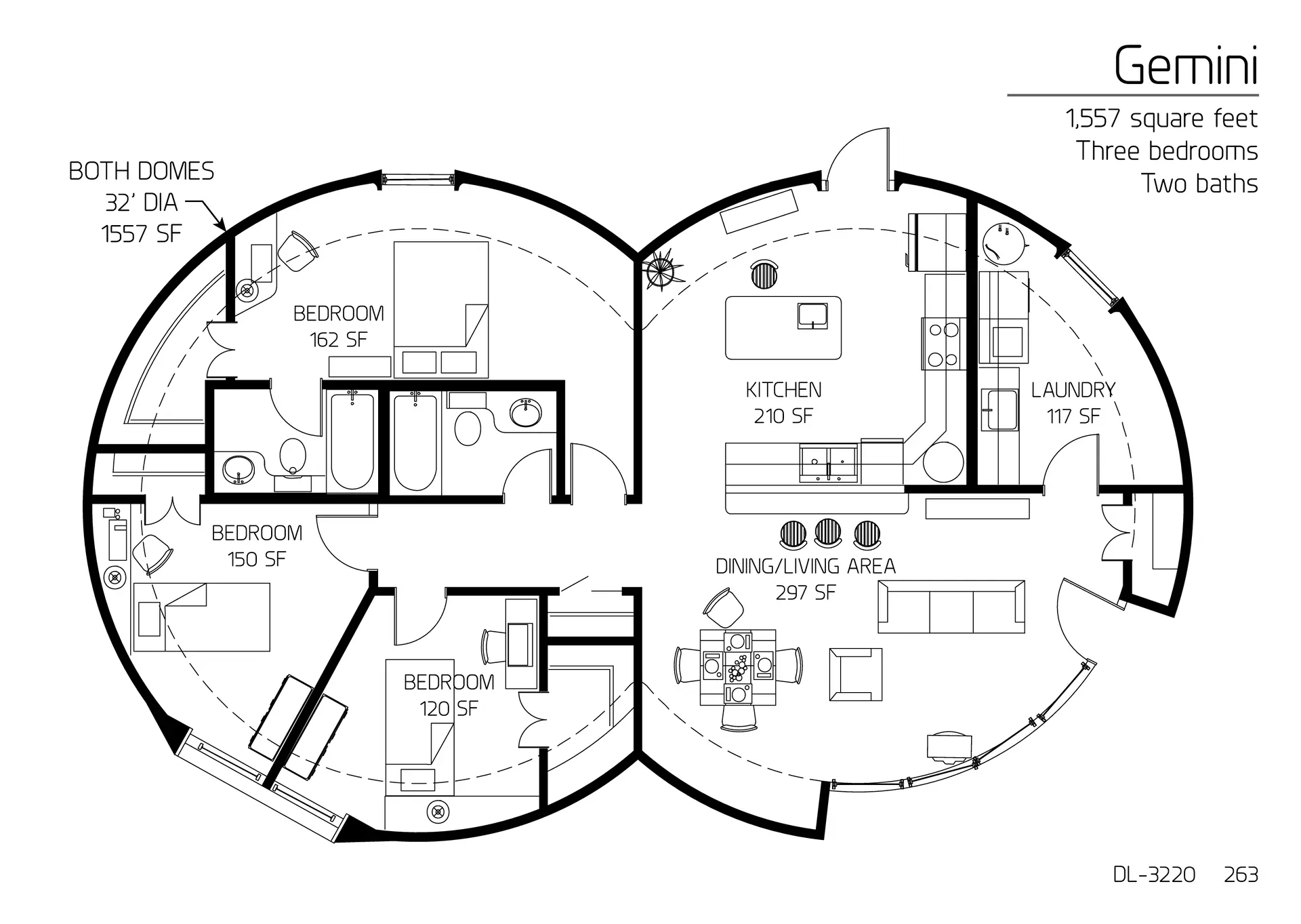 Gemini: A 35' Diameter Double Dome, 1,882 SF, Three-Bedroom, Two-Bath Floor Plan.