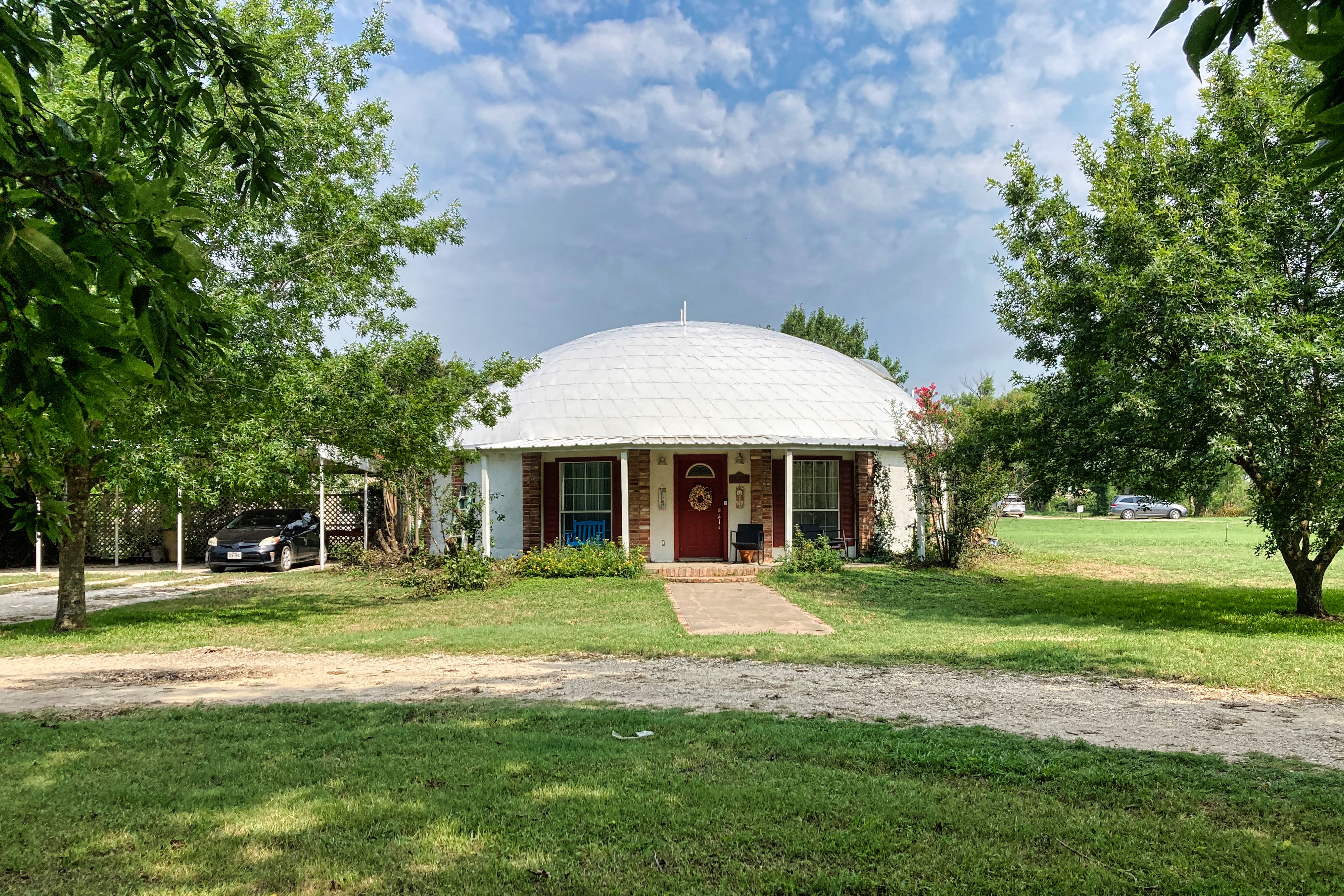 Blue skies and a beautiful newly metal clad roof on the Clark family’s dome home in Italy, Texas.