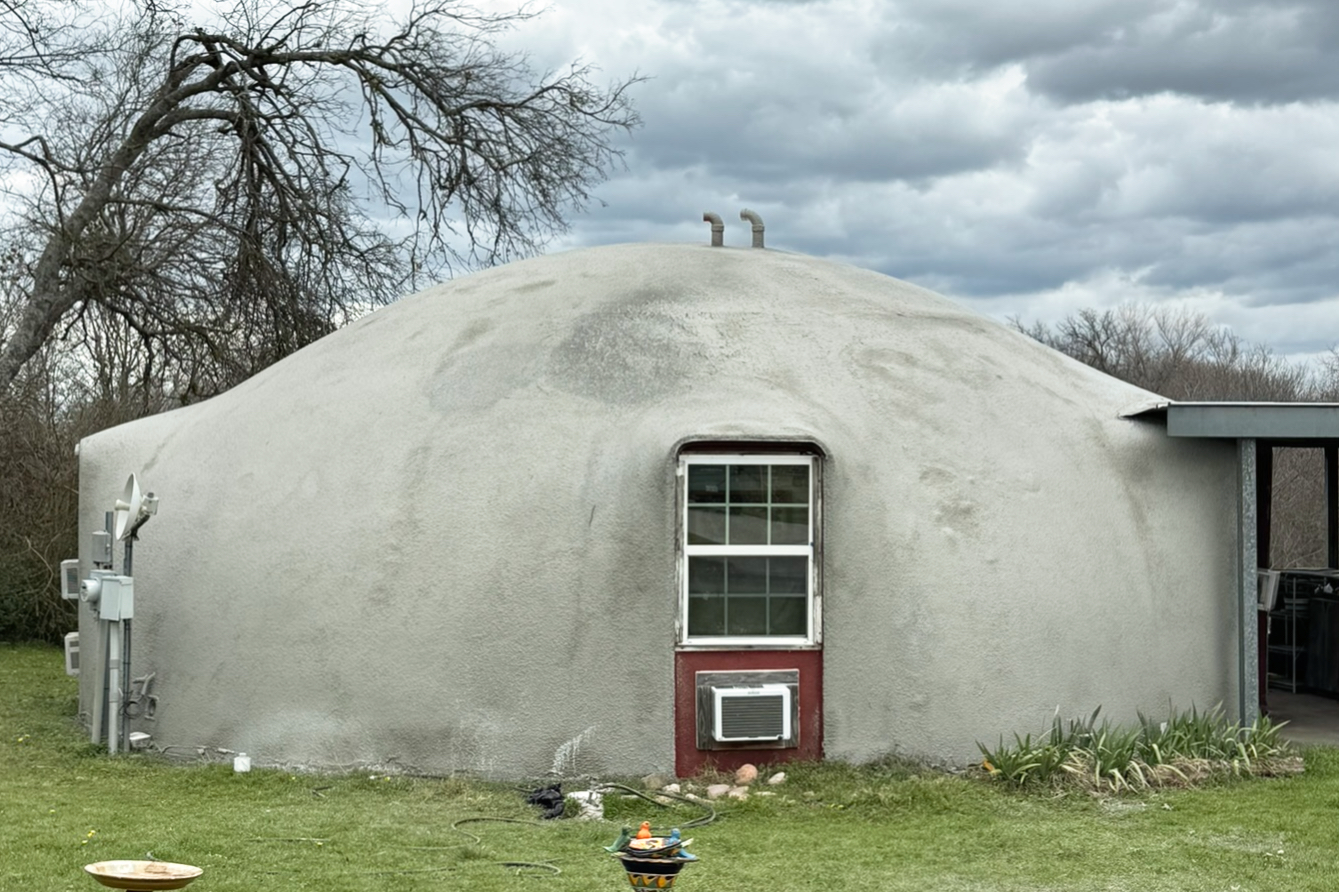 The acrylic concrete base coat can be applied when the dome is ready. A reinforcing mesh is installed mid-spray in areas with large patches.