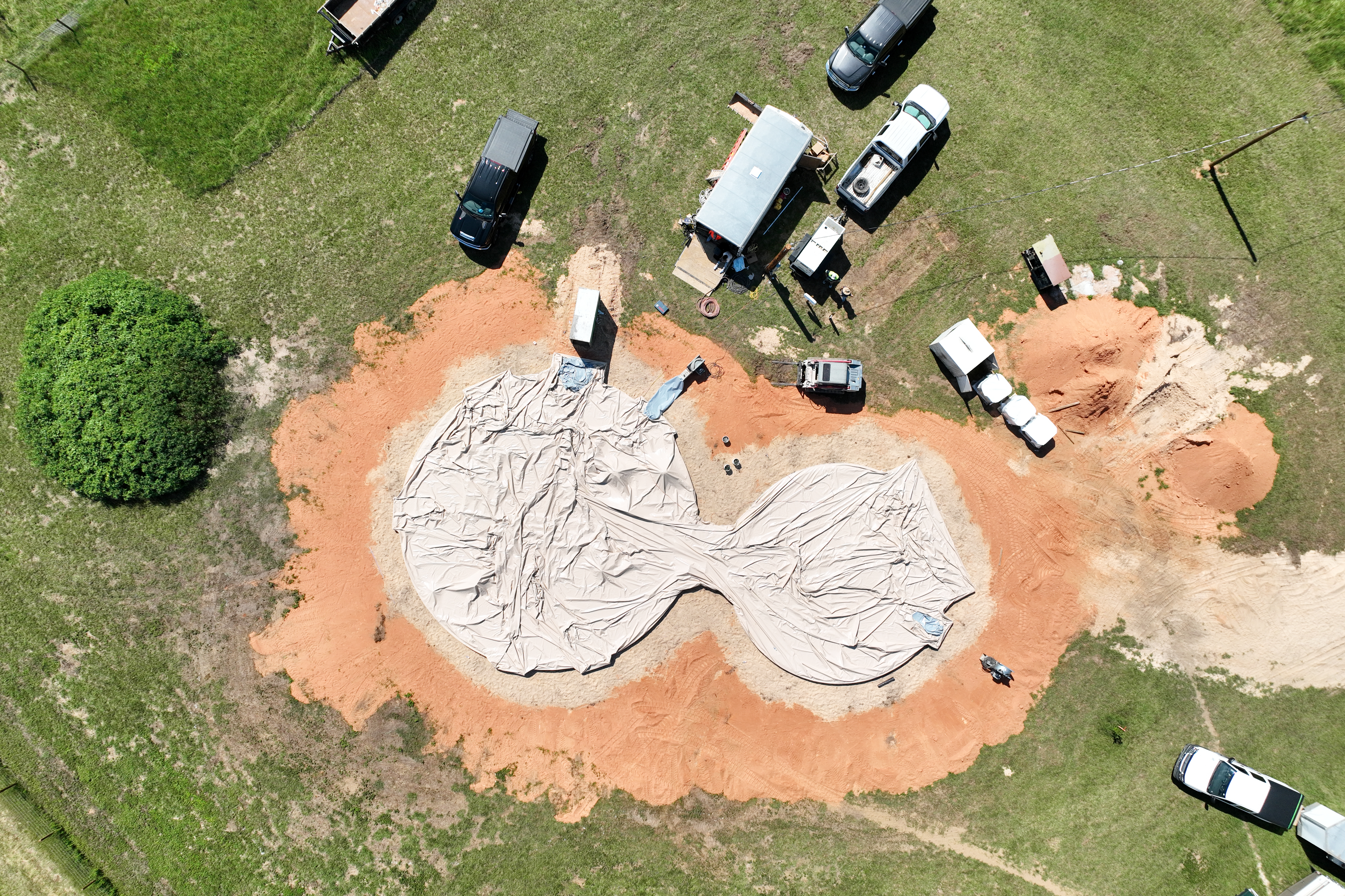 An aerial view of the job site with the Airform in place and ready to be inflated. To the upper left of the connection between the two domes, one inflator fan is connected and ready to start. The second inflator fan is on standby at the bottom right of the Airform. Before applying the foam, we will hook up the second fan to a backup generator to ensure the dome never loses air pressure.