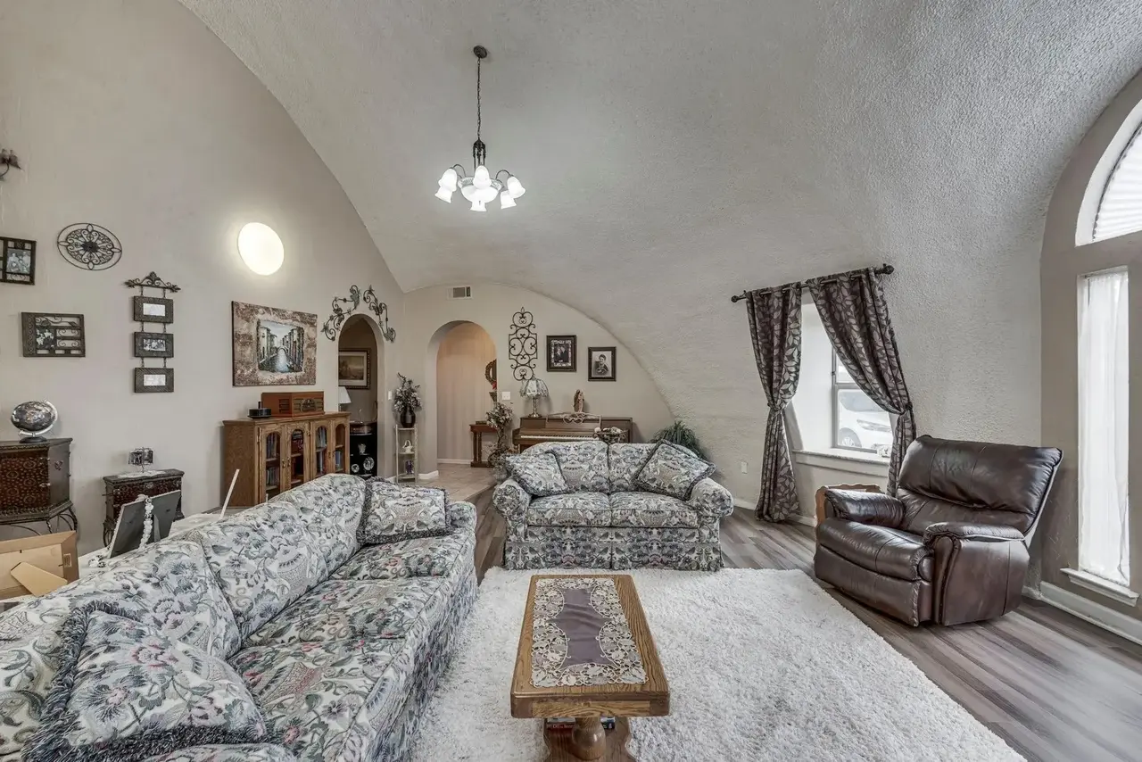 A view from the back door across the great room into the kitchen and front foyer.