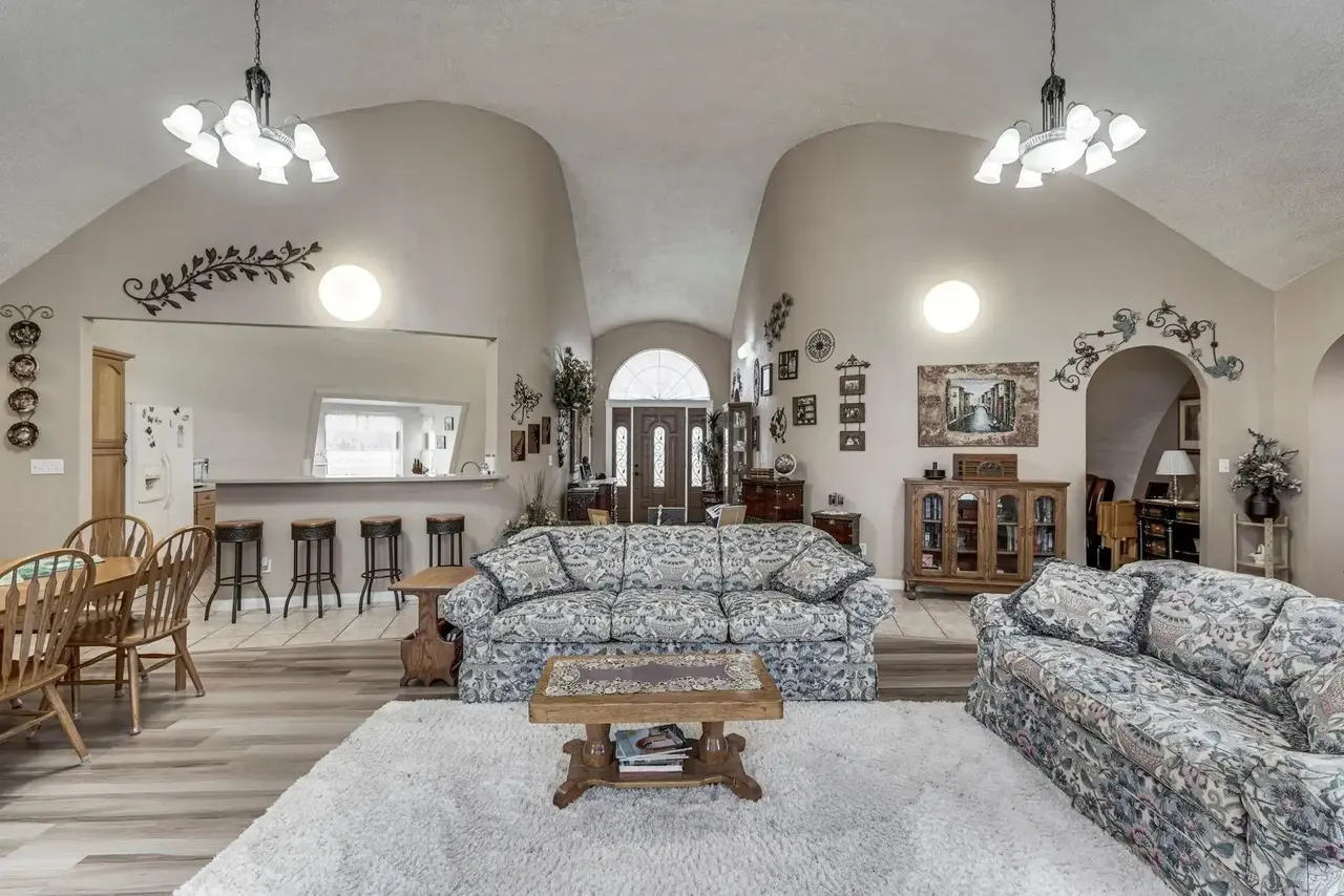 The great room with a dining and living area frames the dramatic arched doorway to the back patio.
