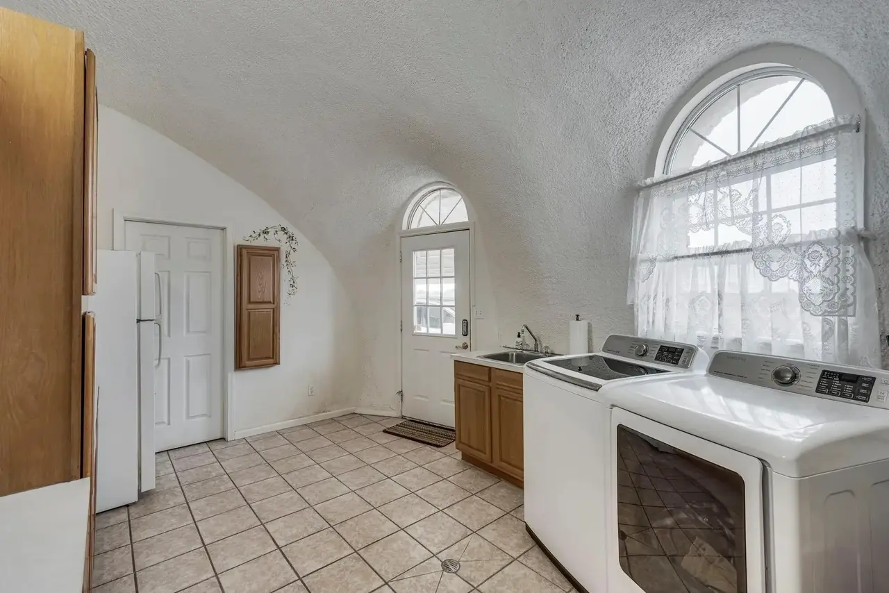 The utility room with laundry, a second refrigerator, and ample storage space was originally a planned workshop, but instead, a second small dome was added to the property as the workshop.