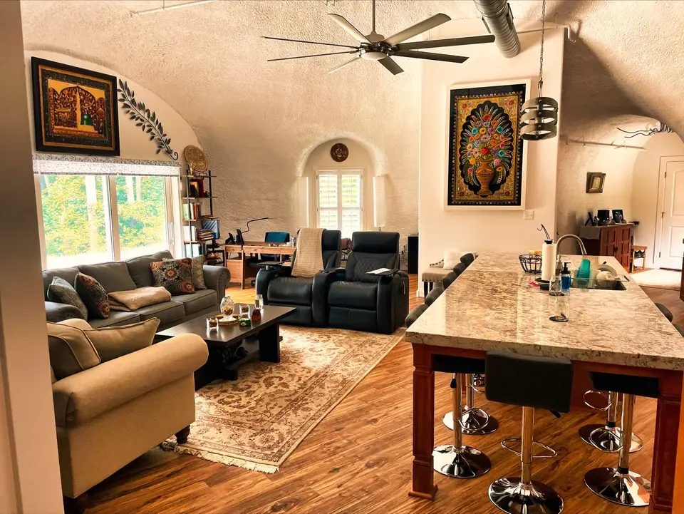The living room has sliding doors that lead out to a large patio. The massive kitchen island matches the custom kitchen.