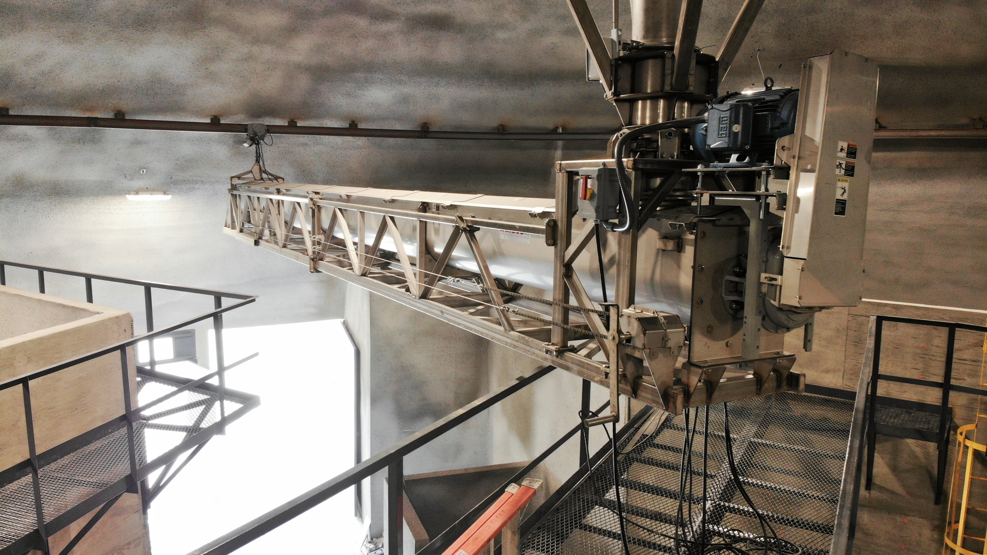 Inside is a steel ring, attached to the concrete shell. A center-pivot conveyor — also known as a polar conveyor — hangs from the dome and is attached to the steel ring using a small motor and wheels. Fertilizer drops down the vertical tube from the head-house into the screw conveyor.
