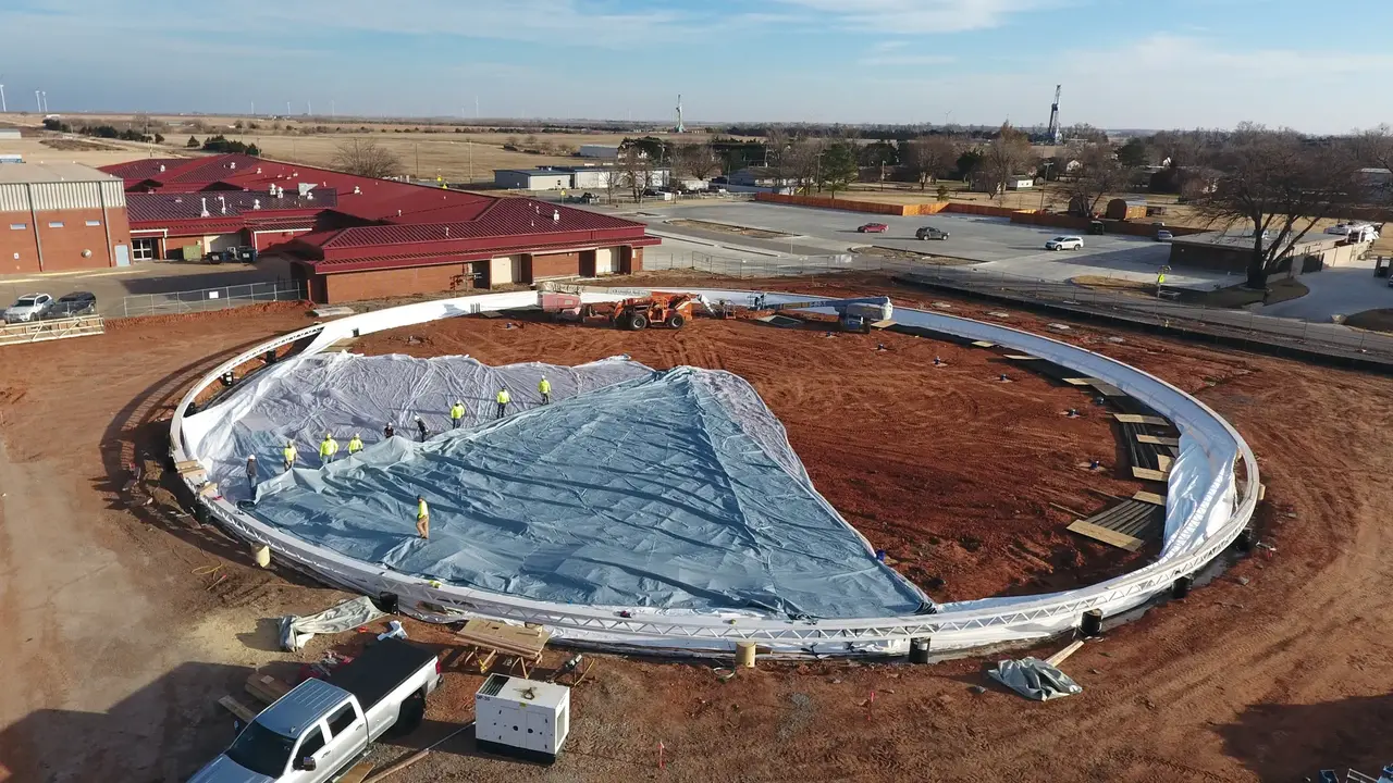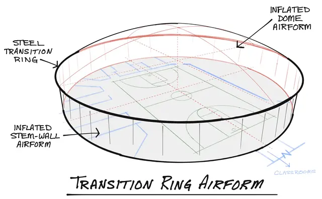 A Transition Ring Airform membrane is composed of three main parts—the steel transition ring, the stem wall membrane, and the dome membrane. The transition ring is lifted into place when the Airform is inflated.