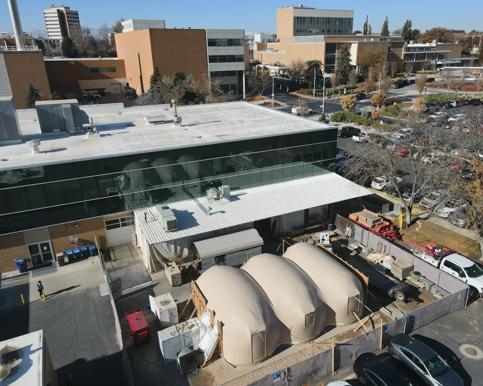 The inflated Airform created the triple-dome shape on the BYU campus. Spacers added during construction allow each module to separate for transport.