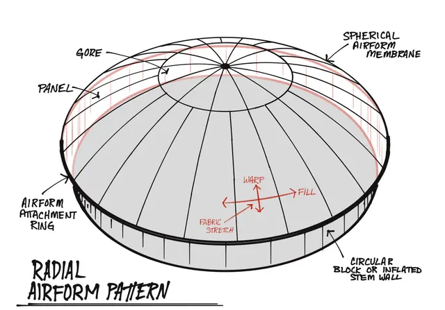 A sketch of how the original Airform membranes are patterned based on a radial gore design. Jack Boyt pioneered this design in the early 1980s. The radial design is best for hemisphere or silo-shaped Monolithic Domes.
