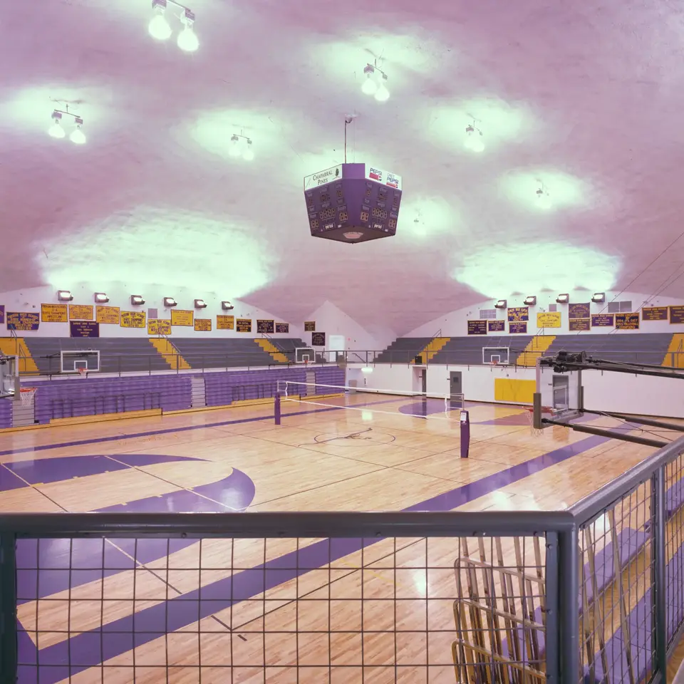With seating for 2400, the Wilson Dome quadrupled the capacity of the old gymnasium. The competition court splits into two courts when the bleachers are retracted. The facility includes a wrestling room, weight rooms, coaches offices, locker rooms, and more.